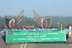 আবদুর রাজ্জাক, বিশেষ প্রতিনিধি: হাজার বছরের শ্রেষ্ঠ বাঙালি, মহান স্বাধীনতার স্থপতি, জাতির পিতা বঙ্গবন্ধু শেখ মুজিবুর রহমানের ১০১তম জন্মবার্ষিকী ও জাতীয় শিশু দিবস-২০২১ যথাযথ মর্যাদা ও উৎসাহ উদ্দীপনার সাথে রামু সেনানিবাসে পালন করা হয়। দিবসটি উপলক্ষ্যে ১০ পদাতিক ডিভিশন ও এরিয়া সদর দপ্তর কক্সবাজারের অধিনস্থ সকল ব্রিগেড/ ইউনিট/ প্রতিষ্ঠানসমূহে যথাযথ স্বাস্থ্যবিধি মেনে বিভিন্ন অনুষ্ঠানের আয়োজন করা হয়। দিবসটিকে স্বরণীয় করে রাখার জন্য রামু সেনানিবাসের সকল ব্রিগেড/ ইউনিট/ প্রতিষ্ঠানসমূহের প্রতিনিধিদের উপস্থিতিতে বর্ণাঢ্য র্যালির আয়োজন করা হয়। উক্ত র্যালিতে প্রধান অতিথি হিসেবে উপস্থিত ছিলেন ১০ পদাতিক ডিভিশনের জিওসি ও এরিয়া কমান্ডার কক্সবাজার এরিয়া মেজর জেনারেল আহম্মদ তাবরেজ শামস চৌধুরী, এসবিপি, এনডিসি, পিএসসি। র্যালিতে জাতির পিতার লোগো সম্বলিত টি-শার্ট পরিহিত অবস্থায় উপস্থিত সামরিক ও অসামরিক ব্যক্তিবর্গ অংশগ্রহণ করেন।