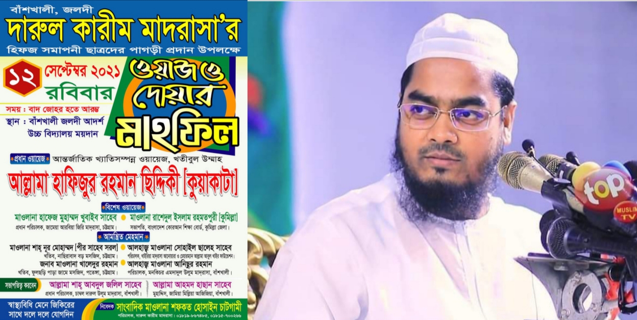 আগামীকাল চট্টগ্রামের বাঁশখালী উপজেলায় আসছেন আন্তর্জাতিক খ্যাতিসম্পন্ন মুফাসসিরে কুরআন খতিবুল উম্মাহ তারুণ্যের আইডল আল্লামা হাফিজুর রহমান সিদ্দিকী (কুয়াকাটা )। তিনি আগামীকাল রোববার (১১ সেপ্টেম্বর) বাঁশখালী দারুল কারীম মাদরাসার হিফজ সমাপনী ছাত্রদের পাগড়ী প্রদান উপলক্ষে বাঁশখালী আদর্শ উচ্চ বিদ্যালয় ময়দানে আয়োজিত ওয়াজ মাহফিলে প্রধান ওয়ায়েজ হিসেবে বাদে এশা তাক্বরীর পেশ করবেন।