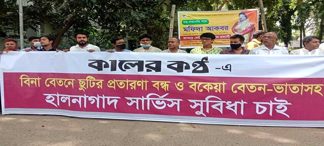 ২০২০ সালের ১০ জুন করোনা মহামারির সময় লকডাউনের মধ্যে এক যোগে বিনা বেতনে অনির্দিষ্টকালের জন্য ছুটি দেওয়া হয় কালের কণ্ঠের ৩৪ জন সাংবাদিক ও কর্মীকে। এরপর এক বছরের বেশি সময় পরেও তারা কাজে ফিরতে পারেননি। শনিবার (২ অক্টোবর) জাতীয় প্রেস ক্লাবের সামনে বিনা বেতনে ছুটি বন্ধ ও বকেয়া বেতনের দাবিতে মানববন্ধন করেন ভুক্তভোগী সাংবাদিকরা।