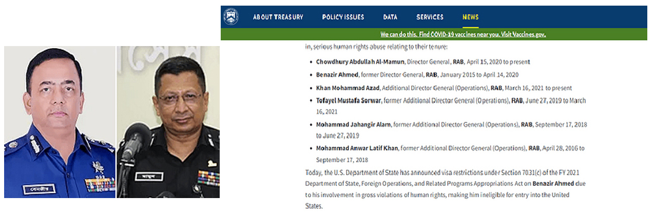 নিষেধাজ্ঞার আওতায় আসা কর্মকর্তাদের মধ্যে বাংলাদেশ পুলিশের মহাপরিদর্শক বেনজীর আহমেদও রয়েছেন। র্যাবের সাবেক মহাপরিচালক হিসেবে নিষেধাজ্ঞার আওতায় এসেছেন তিনি। তাঁর ওপর যুক্তরাষ্ট্রে প্রবেশেও নিষেধাজ্ঞা দিয়েছে দেশটির পররাষ্ট্র দপ্তর।