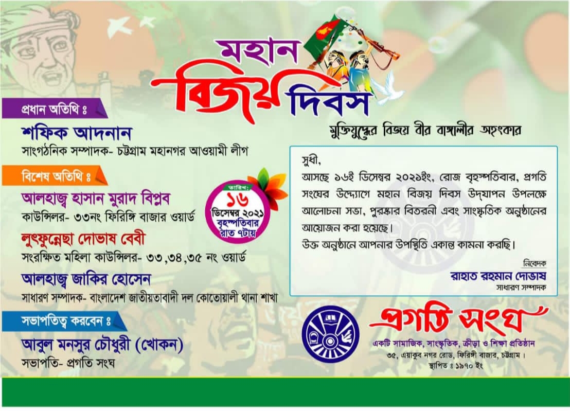কোতোয়ালী থানাস্থ ফিরিঙ্গিবাজার এয়াকুব নগর দোভাষী মাঠ প্রাঙ্গনে ঐতিহ্যবাহী সংগঠন প্রগতি সংঘের উদ্যোগে মহান বিজয় দিবস উপলক্ষে আলোচনা সভা, পুরস্কার বিতরণ ও সাংস্কৃতিক অনুষ্ঠান প্রগতি সংঘের সভাপতি আবুল মনছুর চৌধুরী খোকনের সভাপতিত্বে অনুষ্ঠিত হবে। এতে প্রধান অতিথি হিসেবে উপস্থিত থাকবেন বাংলাদেশ আওয়ামীলীগ চট্টগ্রাম মহানগর শাখার সাংগঠনিক সম্পাদক শফিক আদনান। বিশেষ অতিথি হিসেবে উপস্থিত থাকবেন ৩৩নং ফিরিঙ্গিবাজার ওয়ার্ডের কাউন্সিলর হাসান মুরাদ বিপ্লব, সংরক্ষিত মহিলা কাউন্সিলর লুৎফুন্নেছা দোভাষ, বাংলাদেশ জাতীয়তাবাদী দল কোতোয়ালী থানা শাখার সাধারণ সম্পাদক আলহাজ্ব জাকির হোসেন। উক্ত অনুষ্ঠানে সংশ্লিষ্ট সকলকে উপস্থিত থাকার জন্য অনুরোধ জানিয়েছেন সংগঠনের সাধারণ সম্পাদক রাহাত রহমান দোভাষ।