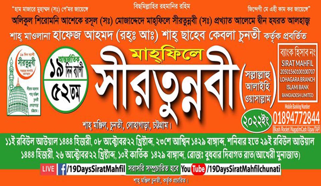 চট্টগ্রামের লোহাগাড়া উপজেলার চুনতির ঐতিহাসিক ১৯ দিনব্যাপী ৫২তম আন্তর্জাতিক মাহফিলে সীরতুন্নবী (স:)-এর কার্যক্রম ৮ অক্টোবর, শনিবার শুরু হয়ে আগামী ২৬ অক্টোবর আখেরি মোনাজাতের মধ্য দিয়ে শেষ হবে। প্রতিবছরের মত মাহফিলকে তাৎপর্যময়, শান্তিপূর্ণ পরিবেশে সম্পন্ন করার লক্ষ্যে মাহফিল আয়োজক কমিটি ও স্থানীয়রা ইতিমধ্যে প্রস্তুতি সম্পন্ন করেছেন। সীরত মাহফিলের যাবতীয় প্রস্তুতি সম্পর্কে অবহিত করতে সীরত মাহফিল মতওয়াল্লী কমিটি কাল (৩০ সেপ্টেম্বর, শুক্রবার) বাদে আছর সীরত ভবনে স্থানীয় সাংবাদিকদের সাথে এক মতবিনিময় সভার আয়োজন করেছে। উক্ত সভায় উপস্থিত থাকার জন্য সংশ্লিষ্ট সকলের বরাবরে বিনয়ের সাথে অনুরোধ জানিয়েছেন মতওয়াল্লী কমিটির সভাপতি শাহজাদা মাওলানা হাফিজুল ইসলাম মুহাম্মদ আবুল কালাম আজাদ।