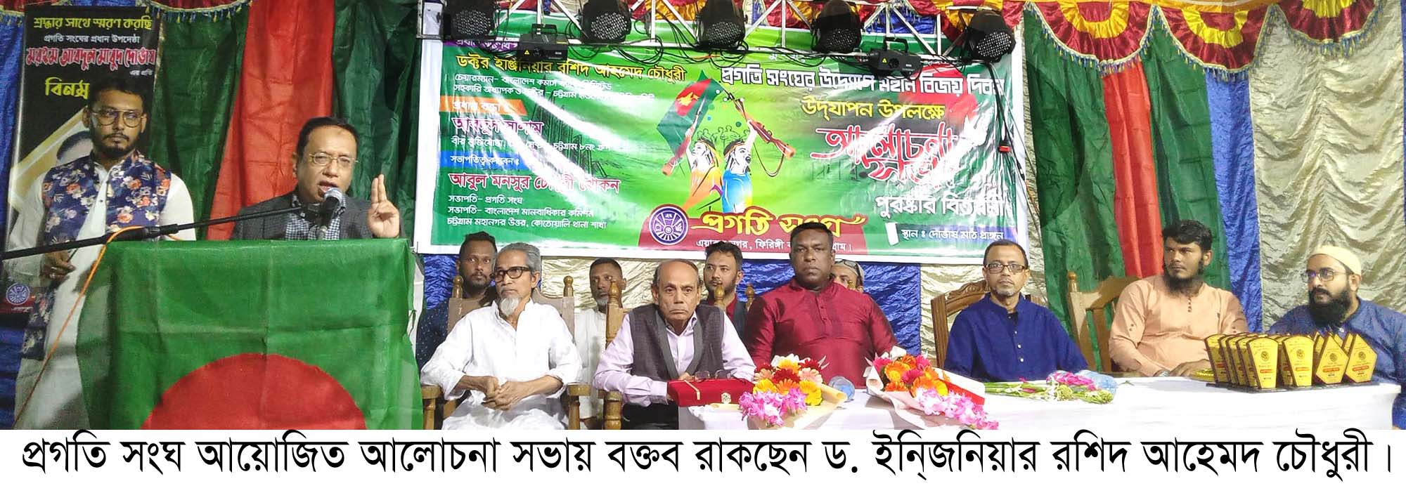 কোতোয়ালী থানাস্থ ফিরিঙ্গিবাজার এয়াকুব নগর দোভাষী মাঠ প্রাঙ্গনে ১৬ ডিসেম্বর শুক্রবার রাত ৯টা থেকে ঐতিহ্যবাহী সংগঠন প্রগতি সংঘের মহান বিজয় দিবস উপলক্ষে প্রগতি সংঘের উদ্যোগে আলোচনা সভা ও সাংস্কৃতিক অনুষ্ঠানের আয়োজন করা হয়। আবুল মনছুর চৌধুরী খোকনের সভাপতিত্বে প্রধান অতিথি হিসেবে উপস্থিত ছিলেন বাংলাদেশ কমার্স ব্যাংক লিমিটেড এর চেয়ারম্যান ও চট্টগ্রাম ইন্ডিপেন্ডেন্ট বিশ্ববিদ্যালয়ের উপ-উপাচার্য ড. ইন্জিনিয়ার রশিদ আহেমদ চৌধুরী।