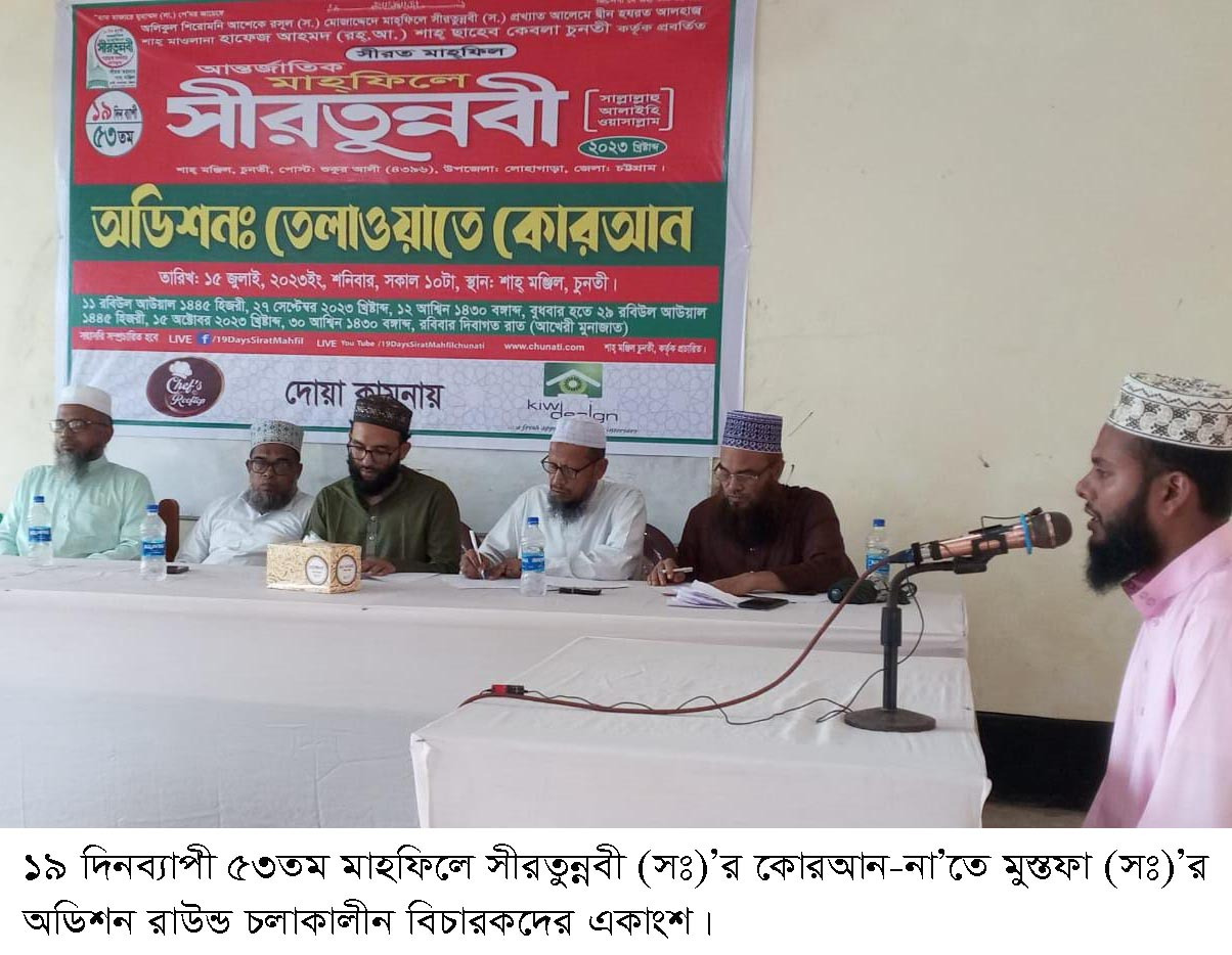 আশেকে রসুল (সঃ) হযরত আলহাজ্ব শাহ্ মওলানা হাফেজ আহমদ (রাহঃ) শাহ্ সাহেব কেবলা চুনতী কর্তৃক প্রবর্তিত ঐতিহাসিক আন্তর্জাতিক ১৯দিনব্যাপী মাহফিলে সীরতুন্নবী (সঃ) এর ৫৩তম আসর উপলক্ষ্যে তেলাওয়াতে কুরআনুল করিম এবং না’তে রাসুল (সঃ) এর অডিশন রাউন্ড ১৫ জুলাই শনিবার সকাল ৯টা হতে সীরত ময়দান সংলগ্ন হলরুমে অনুষ্ঠিত হয়।