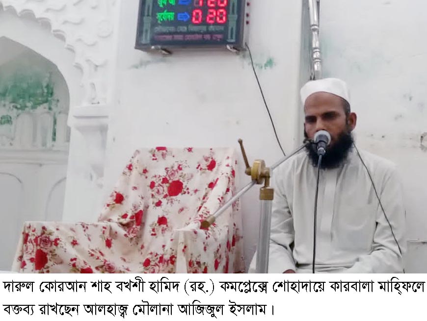 গত ২৯ জুলাই ২০২৩ইং শনিবার বাদে আছর পবিত্র শোহাদায়ে কারবালা স্মরণে আজিমুশ্শান মাহফিল দারুল কোরআন শাহ বখ্শী হামিদ (রহ.) কমপ্লেক্স এর প্রতিষ্ঠাতা সভাপতি আলহাজ্ব হযরতুল আল্লামা হাফেজ কারী শাহসুফী আবদুল মজিদ (মা.) সভাপতিত্বে অনুষ্ঠিত হয়। কমপ্লেক্স এর অর্থ সম্পাদক মোহাম্মদ শহীদ এর পরিচালনায় আলোচনা করেন বাঁশখালী হামেদিয়া রহিমা আলিয়া মাদ্রাসার সাবেক ভারপ্রাপ্ত অধ্যক্ষ পীরে তরিকত রাহনমায়ে শরীয়ত হযরতুল আল্লামা আলহাজ্ব আহমদ নজির, বাঁশখালী হামেদিয়া রহিমা আলিয়া মাদ্রাসার আরবী প্রভাষক আলহাজ্ব মৌলানা আলী আহম্মদ, বাঁশখালী দারুল ইপ্তা দাখিল মাদ্রাসার শিক্ষক আলহাজ্ব মওলানা আকতার ফারুকী, সাতকানিয়া শাহ মজিদিয়া ইসলামিয়া দাখিল মাদ্রাসার শিক্ষক হযরত মওলানা শামসুল হক, জলদি হোসাইনিয়া কামিল মাদ্রাসার উপাধ্যক্ষ আলহাজ্ব মৌলানা আজিজুল ইসলাম। মিলাদ কিয়াম সমাপনী মুনাজাত ও তাবারুক বিতরণ এর মাধ্যমে মাহফিল সমাপ্তি হয়।