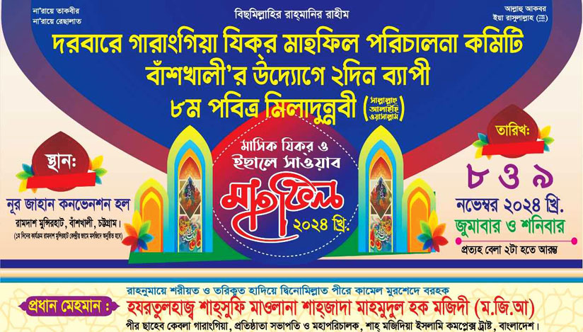 দরবারে গারাংগিয়া যিকির মাহফিল পরিচালনা কমিটি বাঁশখালী’র উদ্যোগে বাঁশখালীর রামদাশ মুন্সিরহাট বাজার সংলগ্ন নূর জাহান কনভেনশন হলে ৮ ও ৯ নভেম্বর জুমাবার ও শনিবার প্রত্যহ বেলা ২টা থেকে আরম্ভ হয়ে ২ দিনব্যাপী ৮ম পবিত্র মিলাদুন্নবী (স.), জিকির, ও ইছালে ছওয়াব মাহফিল অনুষ্ঠিত হবে।