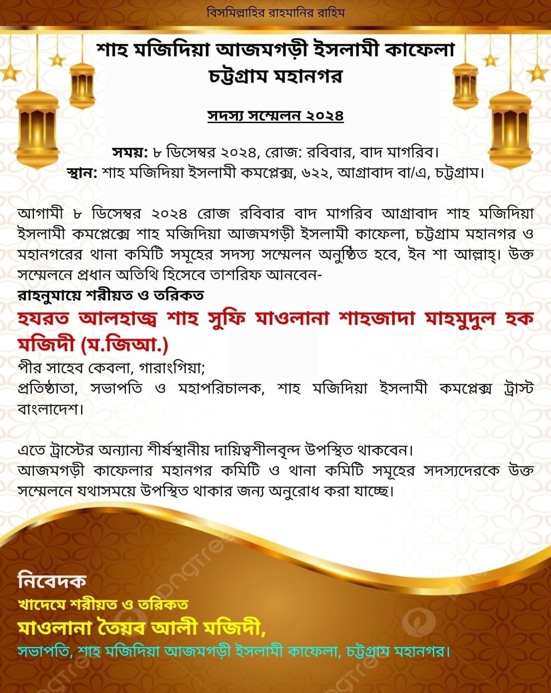 উল্লেখ্য শাহ মজিদিয়া আজমগড়ী ইসলামি কাফেলা চট্টগ্রাম মহানগর এর সম্মেলন অনুষ্ঠিত হবে। এতে সংগঠনের সংশ্লিষ্ট সদস্যদের যথা সময়ে উপস্থিত থাকার জন্য একান্তভাবে অনুরোধ করা হলো।