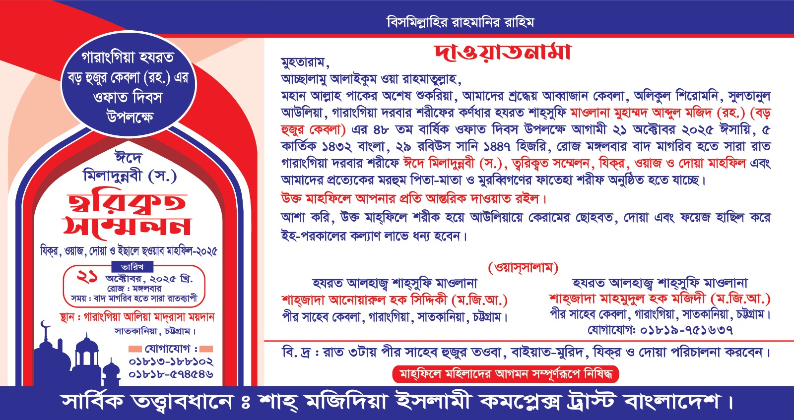 দরবারে আলীয়া গারাংগিয়া ত্বরিক্বত সম্মেলন আগামী ২১ অক্টোবর মঙ্গলবার বাদে আসর থেকে ২০২৫ ইং আজমগড়ি সিলসিলার উজ্জ্বল নক্ষত্র গারাংগিয়া আলিয়া কামিল (এম.এ) মাদ্রাসাসহ অসংখ্যা দ্বীনি শিক্ষা প্রতিষ্ঠানের প্রতিষ্ঠাতা রাহনুমায়ে শরীয়ত হযরত শাহ্সূফী আলহাজ্ব মাওলানা আব্দুল মজিদ (র.) প্রকাশ বড় হুজুর কেবলা (র.) এর ৪৮তম বার্ষিক ওফাত দিবস উপলক্ষে সারারাতব্যাপি ত্বরিক্বত সম্মেলন, যিকির, ওয়াজ ও দোয়া মাহফিল এবং প্রত্যেকের মরহুম পিতা-মাতা ও মুরব্বিগণের জন্যে ফাতেহা শরীফ অনুষ্ঠিত হবে। এই উপলক্ষে ১২ অক্টোবর রবিবার, নগরীর আগ্রাবাদ শাহ মজিদিয়া ইসলামী কমপ্লেক্সে বাদে যোহর এক প্রস্তুতি সভা ও নিয়মিত মাসিক ত্বরিকত বৈঠক, যিকির ও দোয়া মাহ্ফিল দরবারে আলীয়া গারাংগিয়ার পীর সাহেব ও শাহ মজিদিয়া ইসলামী কমপ্লেক্স ট্রাস্টের বাংলাদেশের প্রতিষ্ঠাতা পরিচালক শাহসুফি মাওলানা মাহমদুল হক মজিদীর সভাপতিত্বে অনুষ্ঠিত হবে। বাদে মাগরিব ত্বরিকতের ছবক প্রদান করবেন খলিফায়ে গারাংগিয়া আলহাজ্ব শাহ সুুফি ক্বারী আবদুল মাবুদ। সংশ্লিষ্ট সকলকে ও ভক্ত-অনুরক্তদের উক্ত প্রস্তুতি সভা, মাসিক তরিক্বত বৈঠক, যিকির ও দোয়া মাহফিলে উপস্থিত থাকার জন্য আন্তরিক দাওয়াত জানিয়েছেন কমপ্লেক্সের পরিচালক শাহজাদা মাওলানা মঈনউদ্দীন মজিদী।