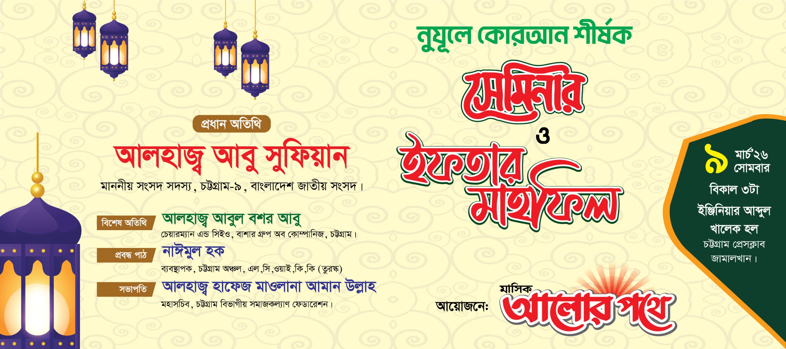 পবিত্র মাহে রমজান উপলক্ষে চট্টগ্রাম থেকে নিয়মিত প্রকাশিত ইসলামিক ম্যাগাজিন “মাসিক আলোর পথ”এর উদ্যোগে আজ (৯ মার্চ ২০২৬) সোমবার নূযুলে কোরআন শীর্ষক সেমিনার ও ইফতার মাহফিল অনুষ্ঠিত হবে।